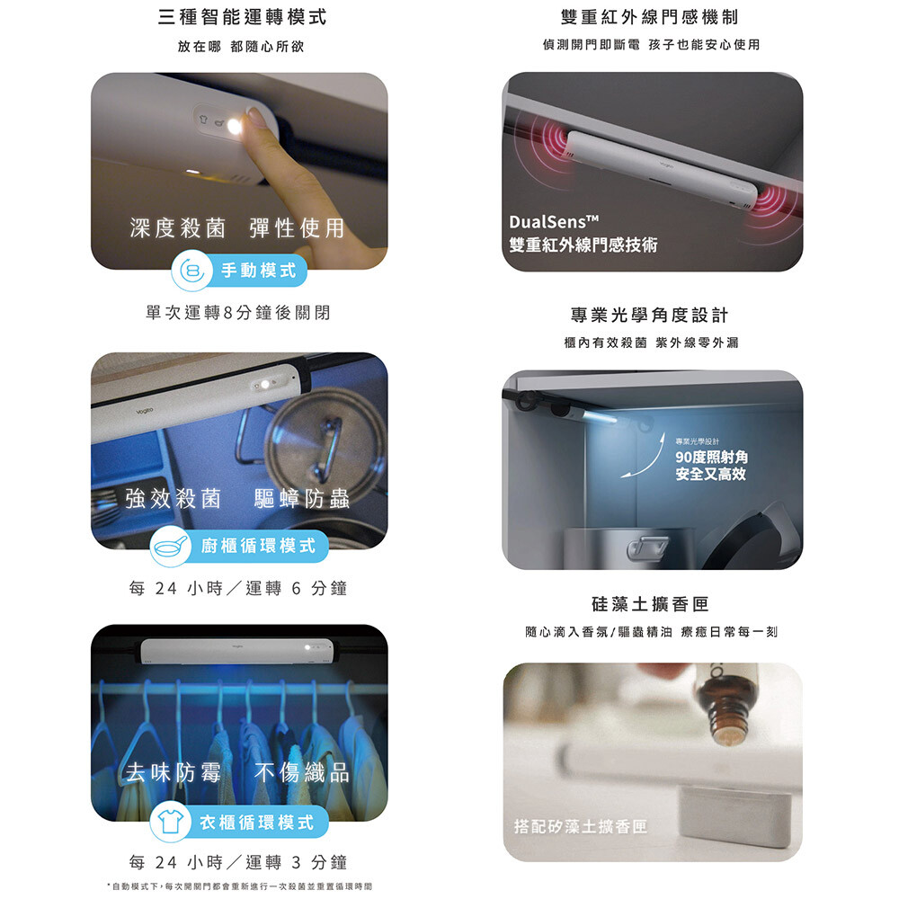 消毒媒介:雙波長紫外光UV-C CCFL、情境照明LED