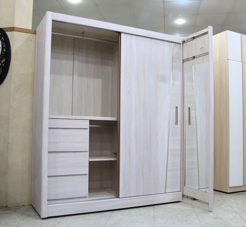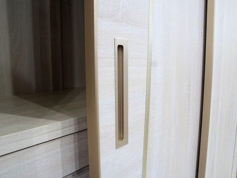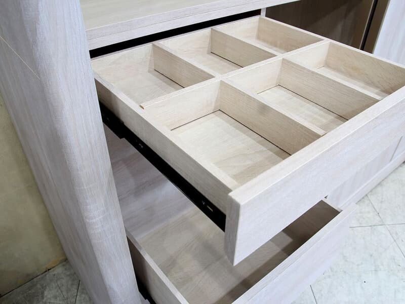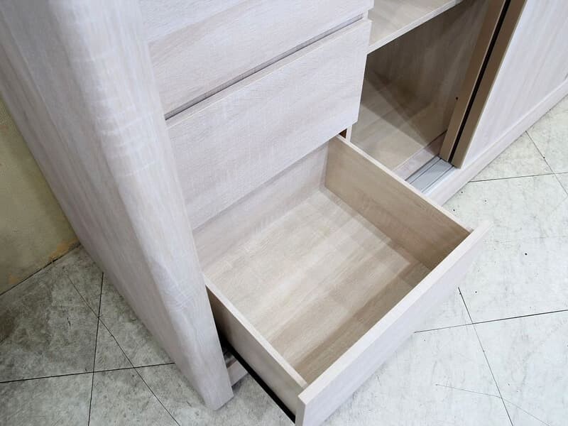 | 材質 | 板材 : 門片,內外桶身,抽屜面板及隔板皆為木心板材 塗裝 : 洗白色浮雕耐磨木皮,表面紋理觸感如實木皮質感,左右側弧形線板質感細緻 五金 : 門片採用最新緩衝五金,關門到底會自動吸入,門片玫瑰金色鋁框包覆,內嵌玫瑰金色把手,上下靜音鋁合金軌道 內部抽屜雙截式鋼珠滑軌,鋁合金吊桿,內建一組宮格,三個抽屜,一組鐵籃,一片活動隔板及大型側拉穿衣鏡 |