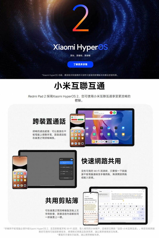 Redmi Pad 2 運行 Xiaomi HyperOS 2 操作介面,內建聯發科 Helio G100-Ultra 八核心處理器,提供 4GB + 128GB、8GB + 256GB 兩種容量版本,支援 microSD 記憶卡最高 2TB 儲存擴充。續航方面,配備 9,000mAh 電池,專為長效耐用而設計,最高可實現 86 天待機、17 小時影片播放或 234 小時音樂播放,支援 18W 充電速度。
