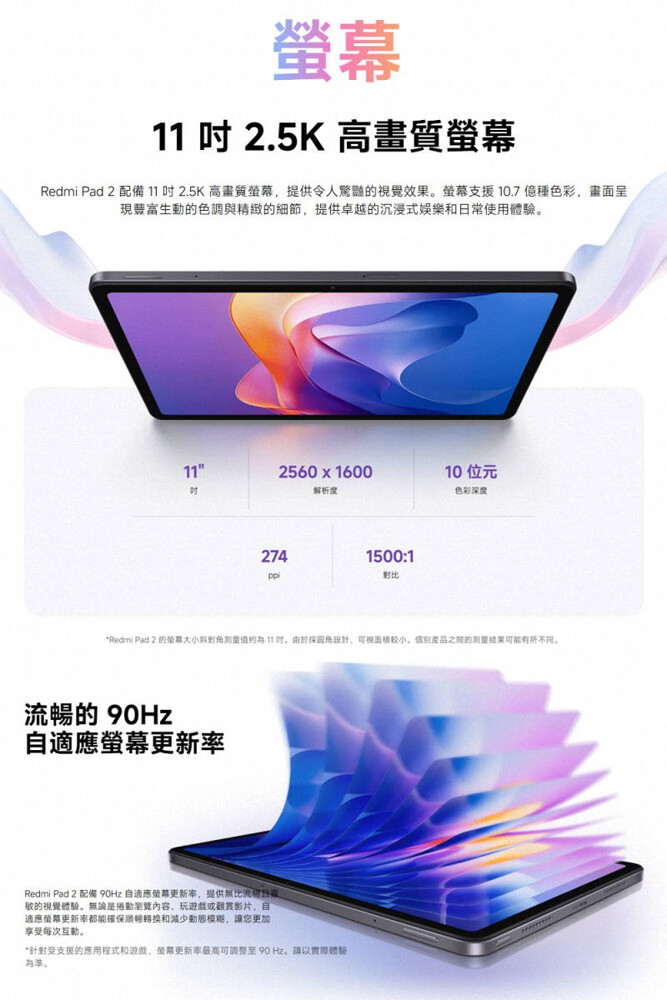 Redmi Pad 2 配備 11 吋 16:10 比例 2.5K 高畫質螢幕,支援 90Hz 自適應螢幕更新率,無論是捲動瀏覽內容、玩遊戲或觀賞影片,都能確保順暢轉換並且減少動態模糊;螢幕支援 10.7 億種色彩表現,畫面可呈現豐富生動的色調與精緻的細節。具備 DC 調光與 TÜV Rheinland 低藍光,提供全天候的眼睛舒適度。
